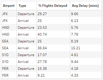 - Calculate the average delay and % of flights which were delayed for each Airport, for each journey type