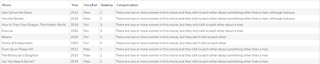 In celebration of International Women's Day (even though it was yesterday), I thought it would be fun to take a look at which movies pass the Bechdel Test. If you're unfamiliar, there are 3 criteria to passing the Bechdel Test: