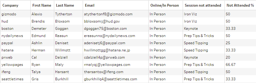 The challenge this week had a Tableau Conference theme, and focussed on session attendance in the hybrid world of the virtual and in-person conference. We wanted to see who were unable to join a session that they had registered for at the conference. All data is mocked up!
